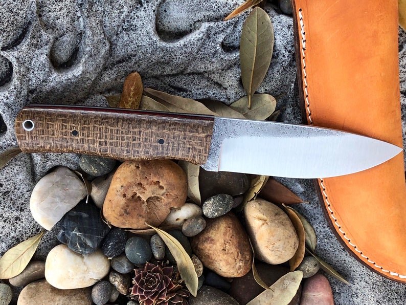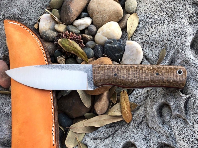 9 Inch Handmade Drop Point Fixed Blade Knife, Leather Sheath, Hiking, Bushcrafting or Camping, Cowboy Coffee Burlap Micarta Handle
