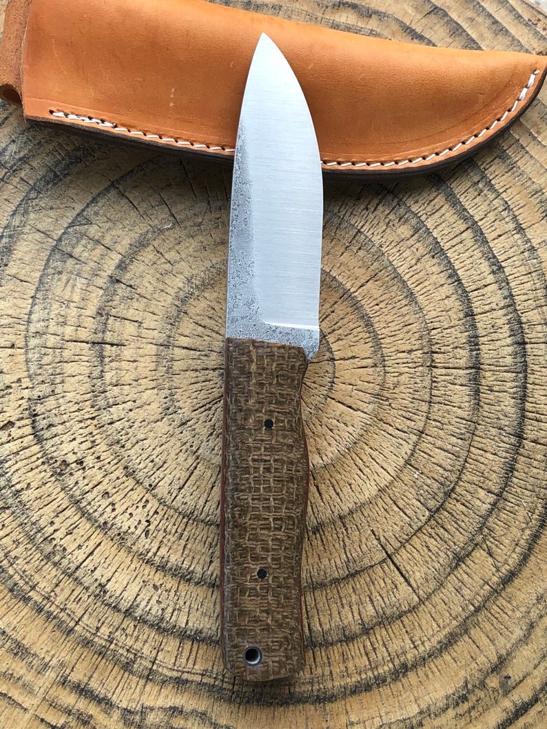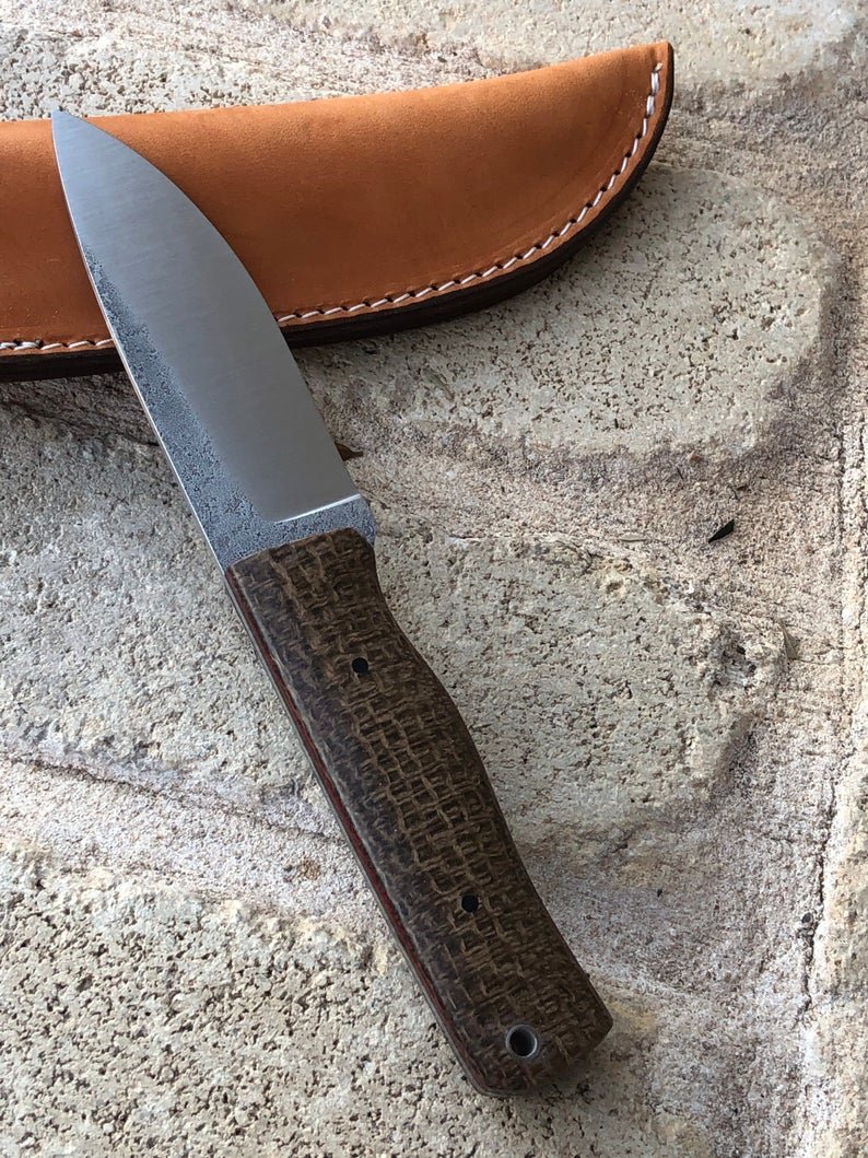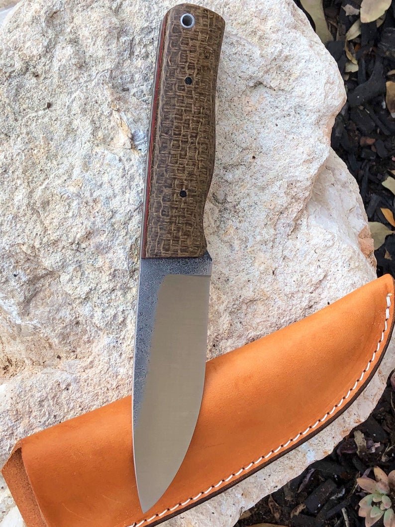 This 9” Drop Point Fixed blade has a 4 1/2” blade and 4 1/2 “ Cowboy Coffee Burlap Micarta with black liners and red pinstripe handle. The blade was formed from 1/8” 80crv2 high carbon steel.