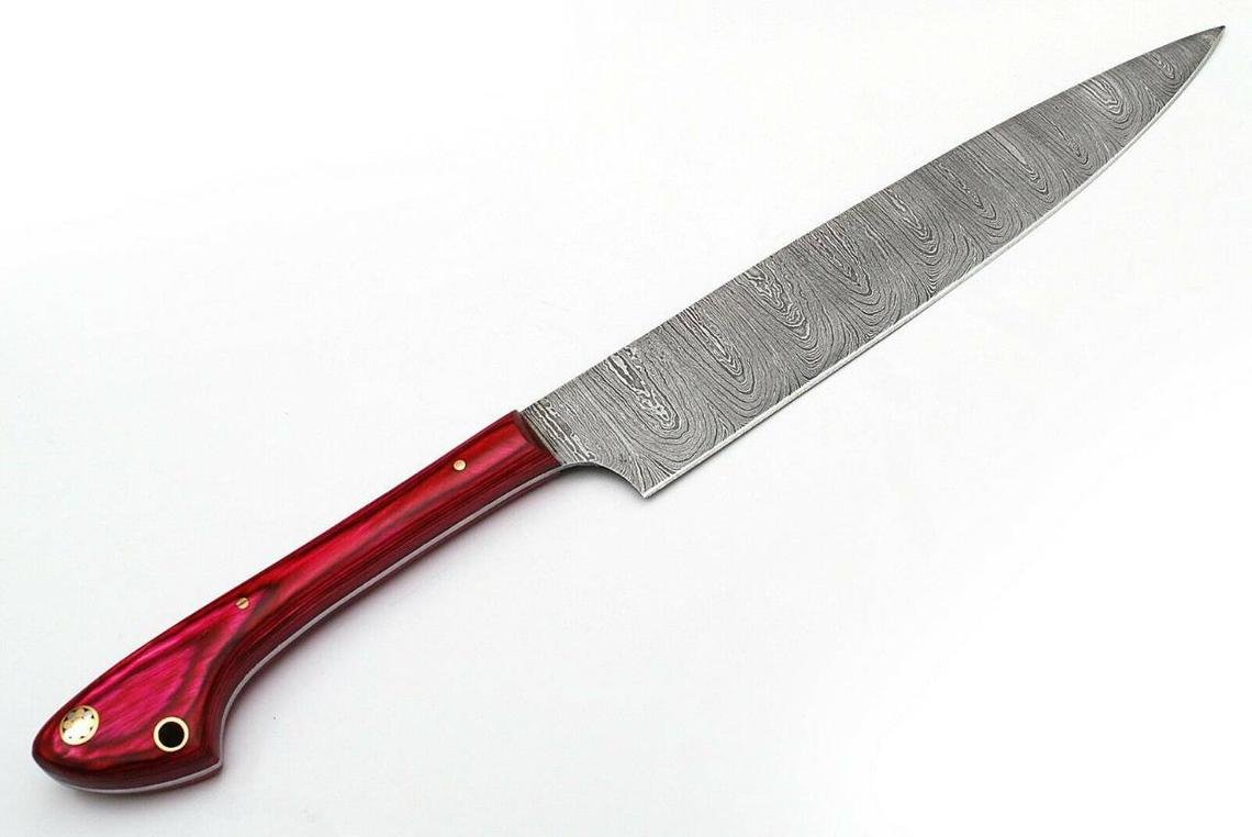 Only quality materials have been used to create this beautiful Knife, hand forged kitchen knife. Featuring High Grade Damascus Steel blade. The Pink Wood scale is fixed with brass mosaic pins. Comfortable in your hand, you will volunteer to be the cook tonight!