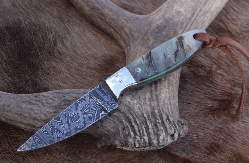 CUSTOM HANDMADE DAMASCUS STEEL COWBOY KNIFE FOR CAMPING, HUNTING WITH SHEEP HORN HANDLE AND LEATHER SHEATH.