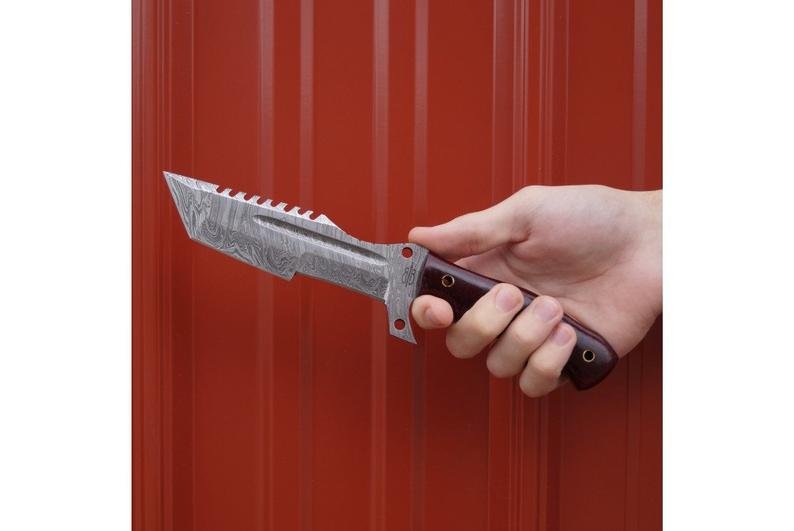 This sharp looking outdoorsman knife has a damascus steel blade with full tang construction. Blade is 3/32″ thick and 1 3/8″ deep. Notching and filework on spine and tang. The handle is Red Micarta with brass pins. Includes a premium leather sheath with belt loop for a horizontal carry.