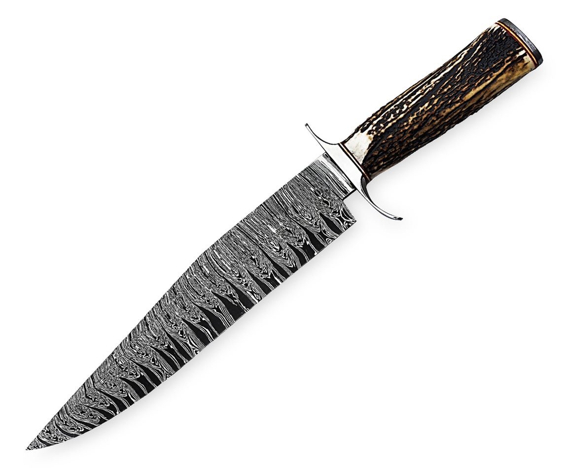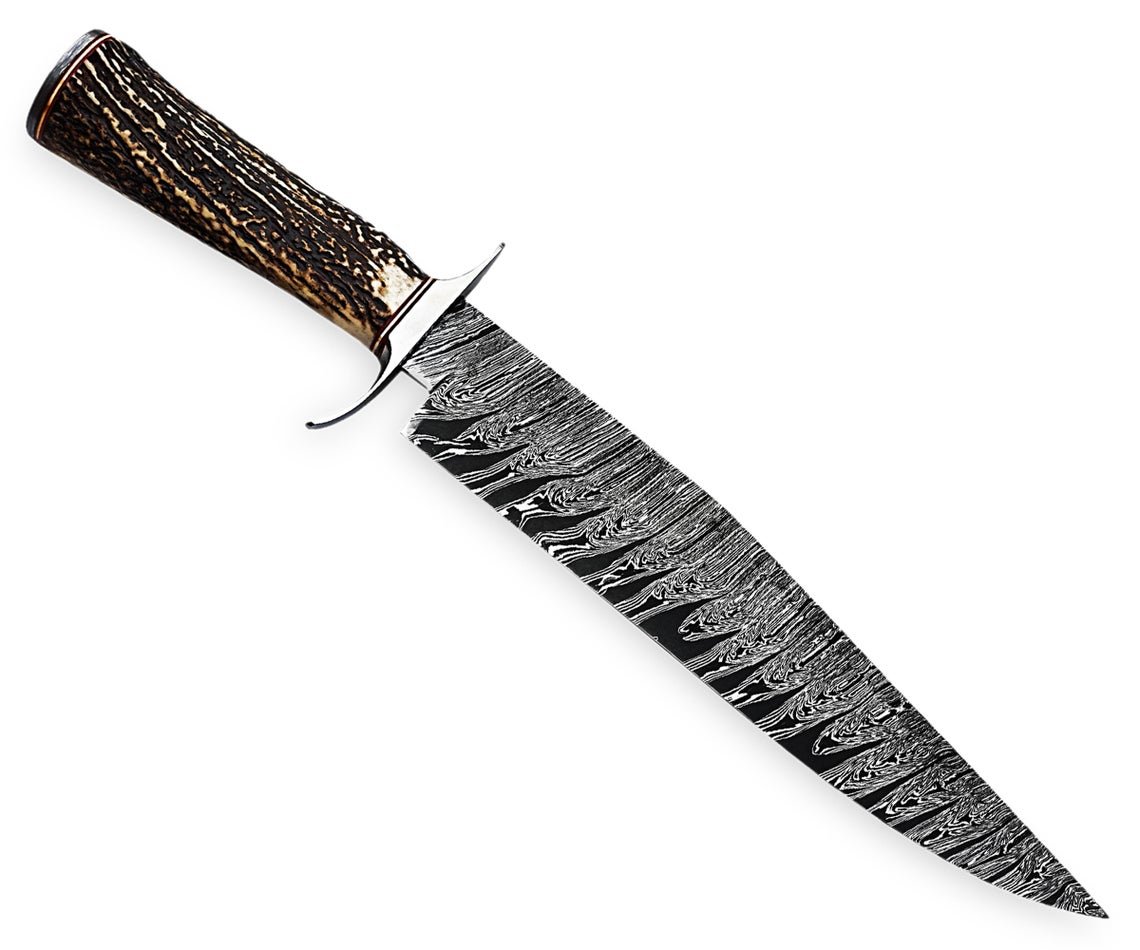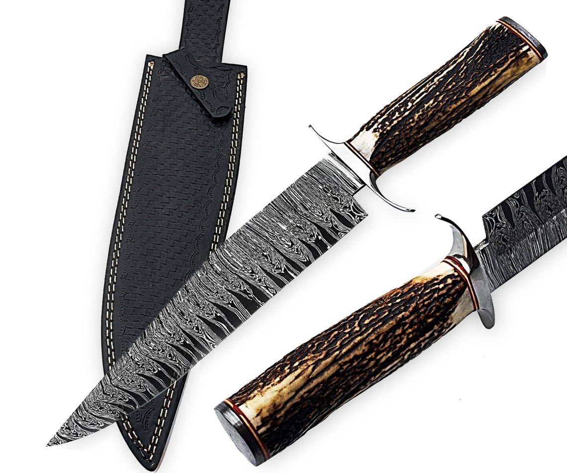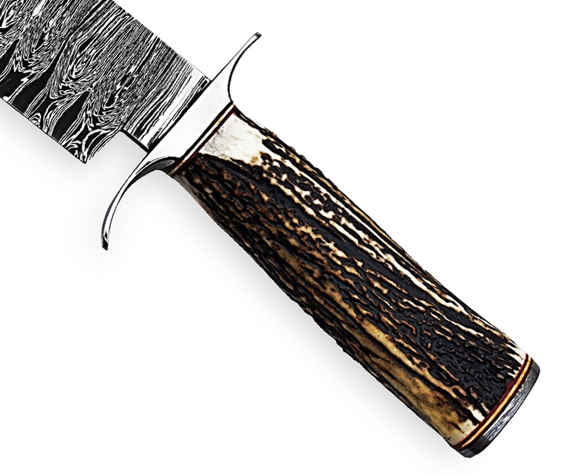 Custom Handmade Professional Damascus Steel Blade Hunting Camping Bowie Knife With Original Natural Horns Stag Handle & Steel Bolster.