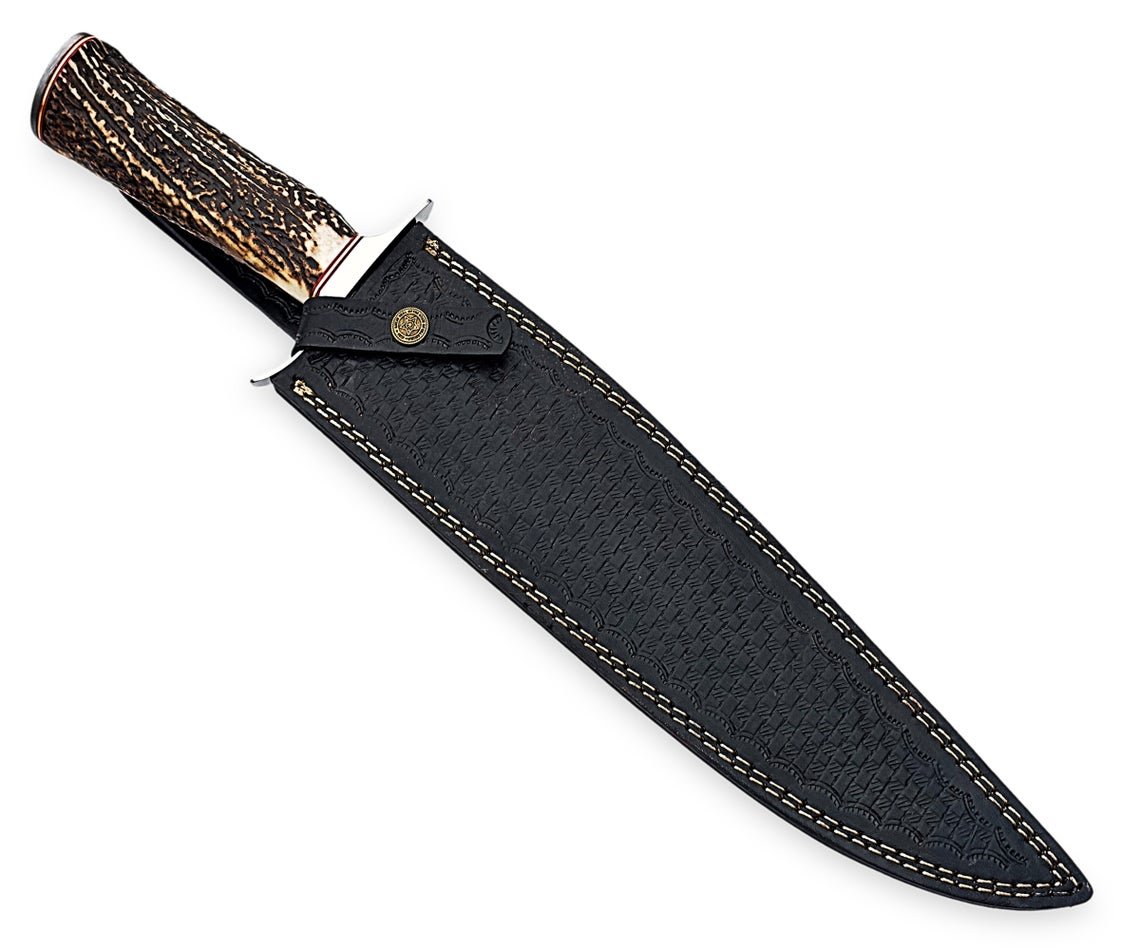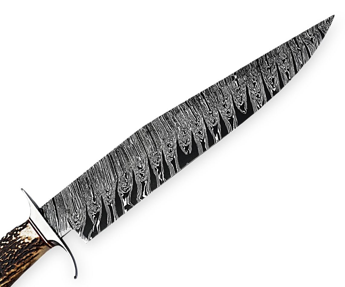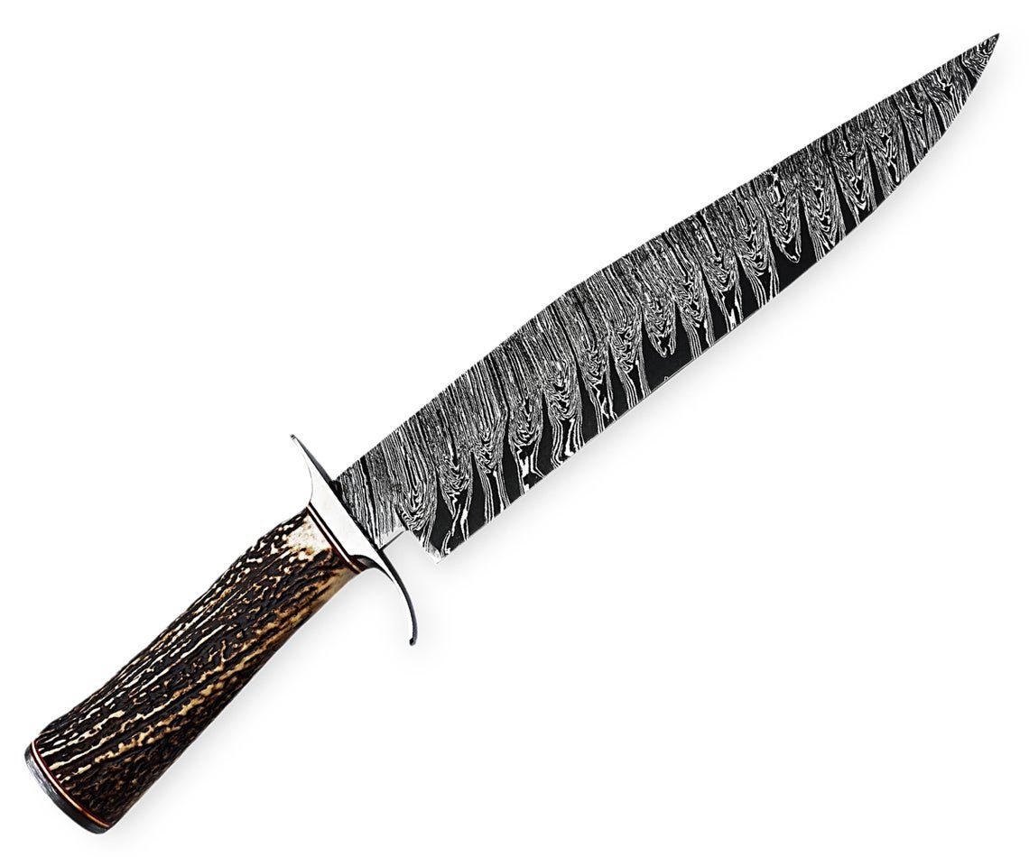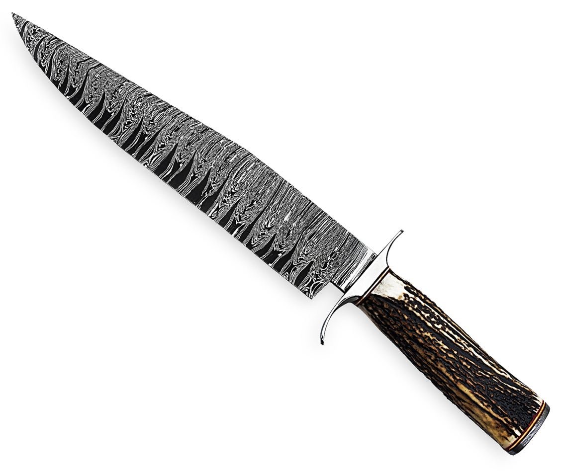 Custom Handmade Professional Damascus Steel Blade Hunting Camping Bowie Knife With Original Natural Horns Stag Handle & Steel Bolster.