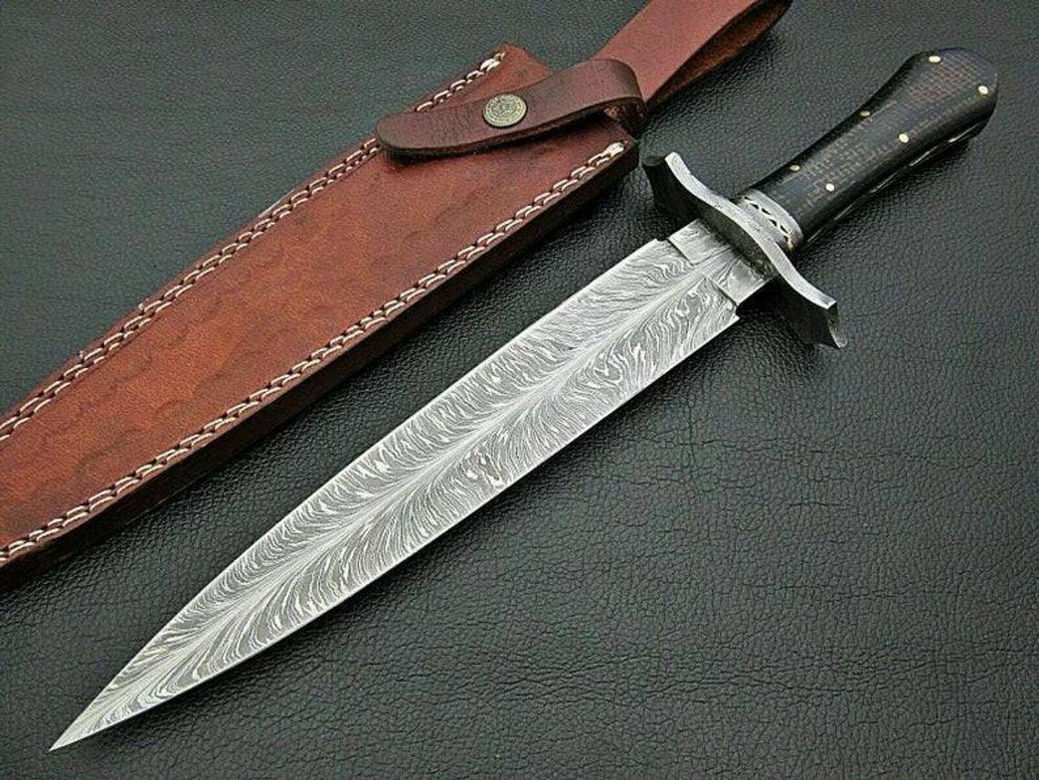 Custom Made Damascus Steel Feather Pattern Dagger Bowei Knife
