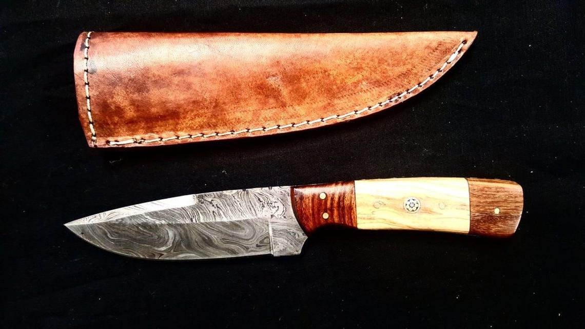 Titan International Knives Damascus Hunting/utility knife is hand crafted to be functional and not just for looks. Utility Knife has over 18 hrs of work into it including forging, filing, fitting, grinding, polishing. The Walnut Wood and Olive Wood scales are locked in place with the multiple Brass pins. The handle has a very smooth grip to it which feels natural when held in the hand. The knife is weighted to have a balance point just above the bolster, to better help in hunting Jobs. Remarkable workmanship on this knife!