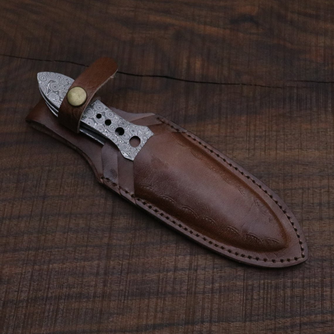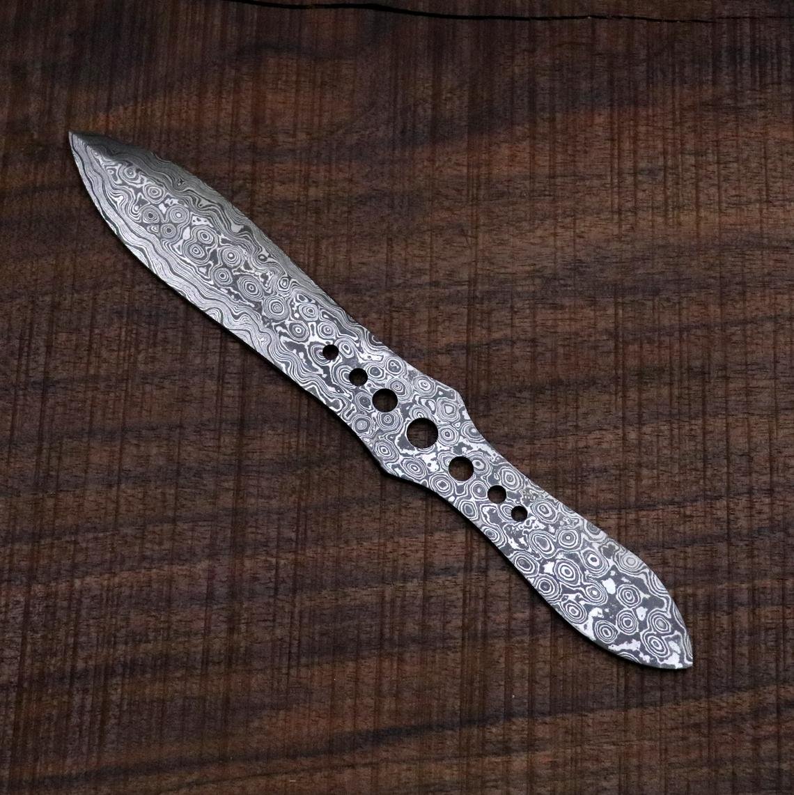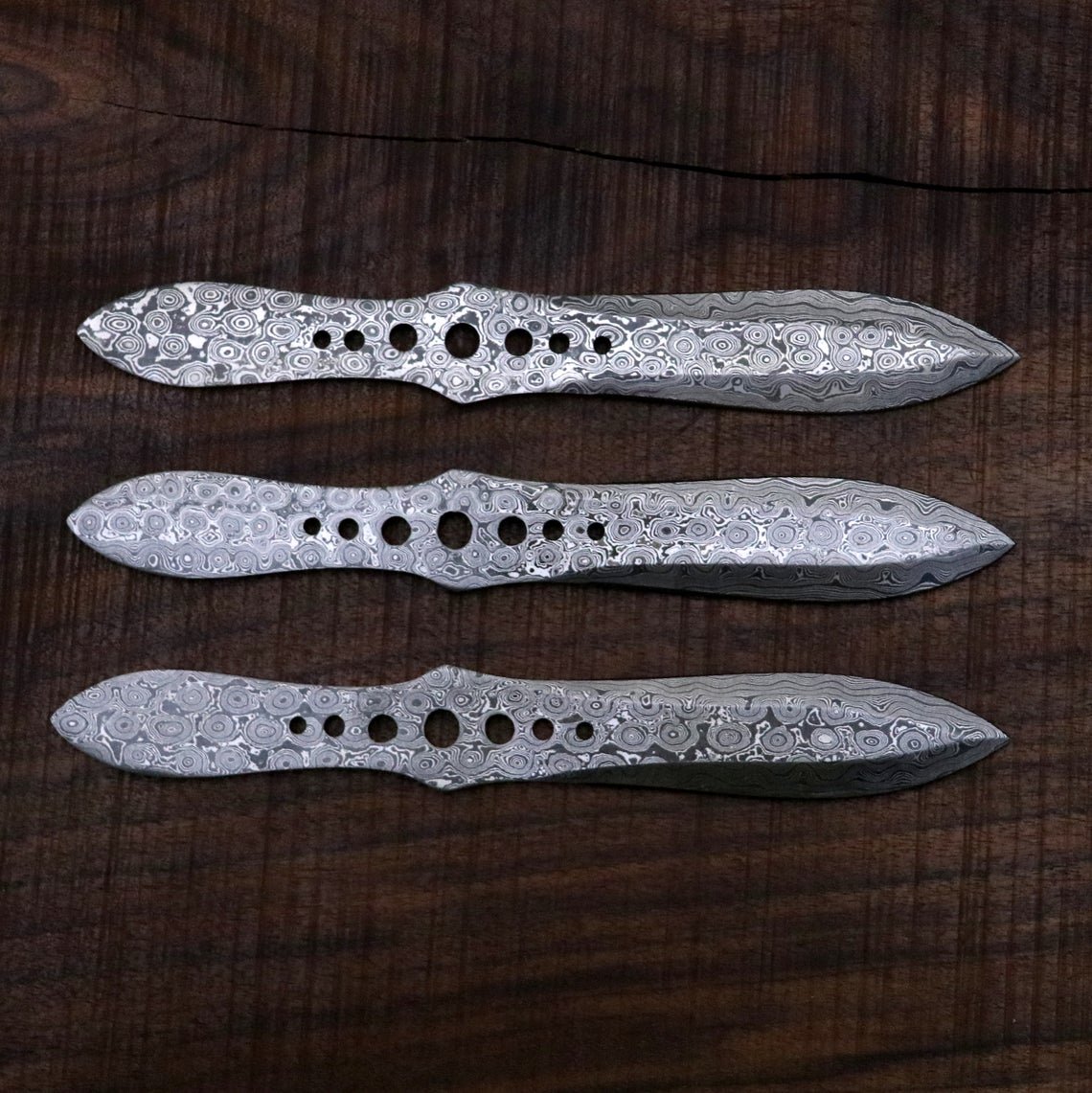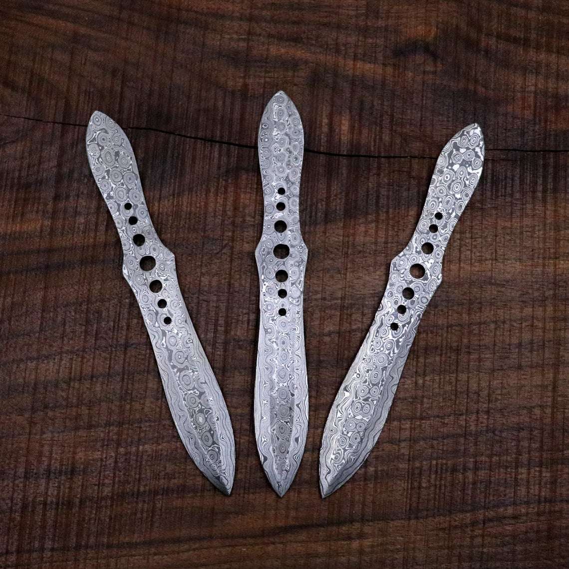 Fully Balanced Throwing knives in Damascus Steel (Raindrop Pattern) that come with a leather case for holding all three together.
