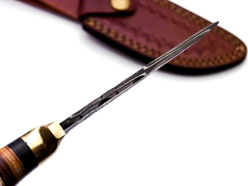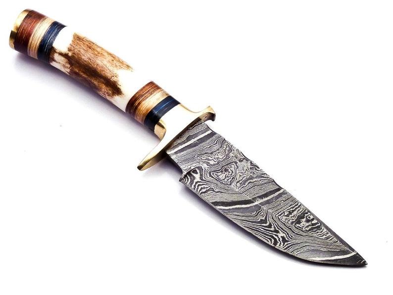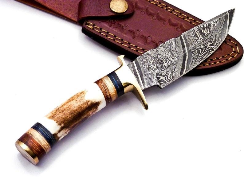 HANDMADE STEEL DAMASCUS HUNTING KNIFE – Blade is Hand Forged with 1095 & 15N20 High and Low Carbon Steel with over 252 Layers. These two alloys are folded together many times, then dipped in Ferric Chloride which eats away at the different metals at different rates showing the Damascus pattern. This is genuine folded steel, not laser printed.