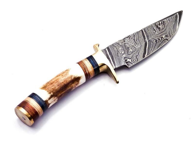 Handmade Damascus Steel Hunting knife Handle Deer Antler with leather Sheath