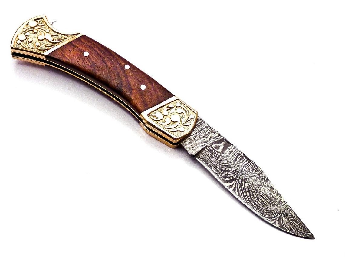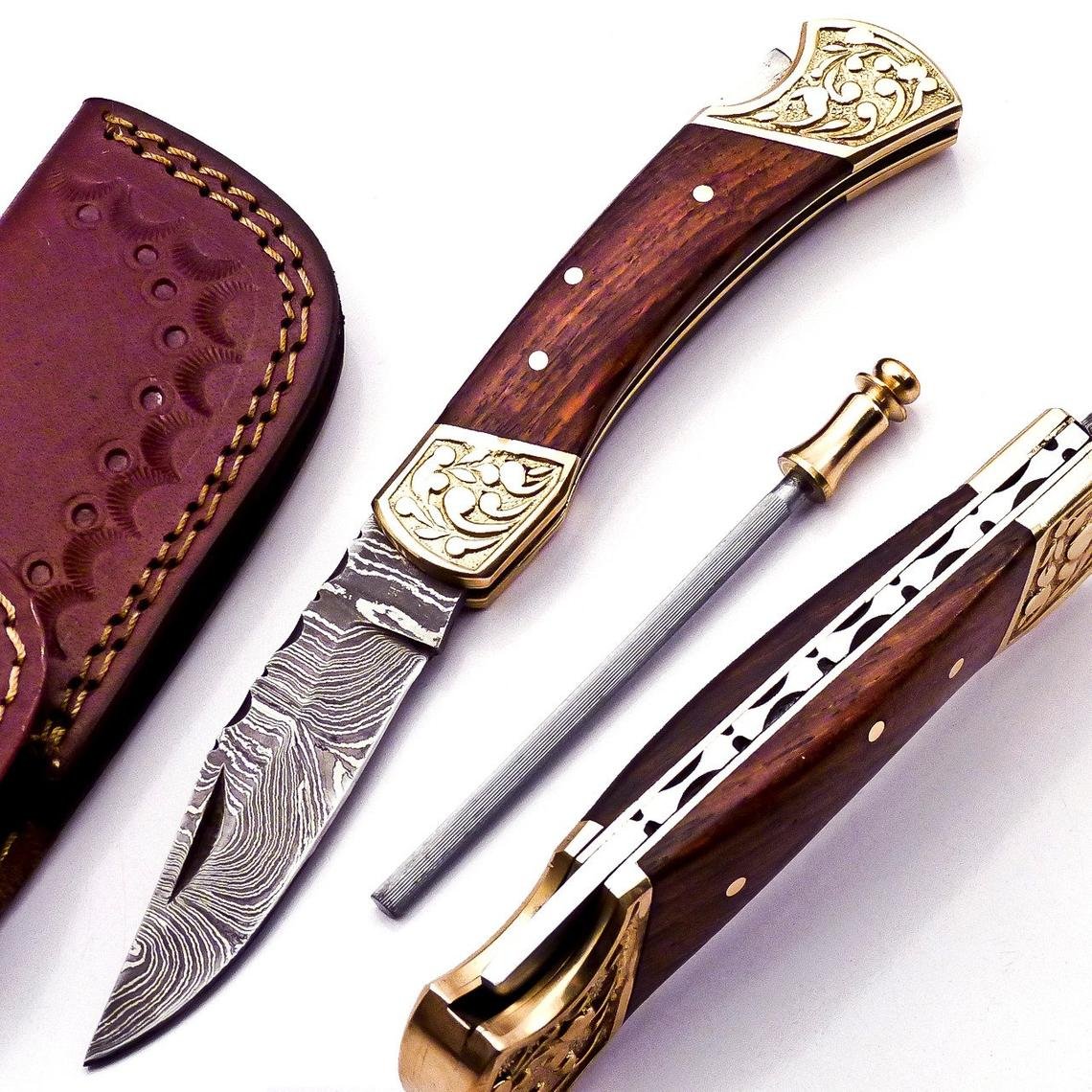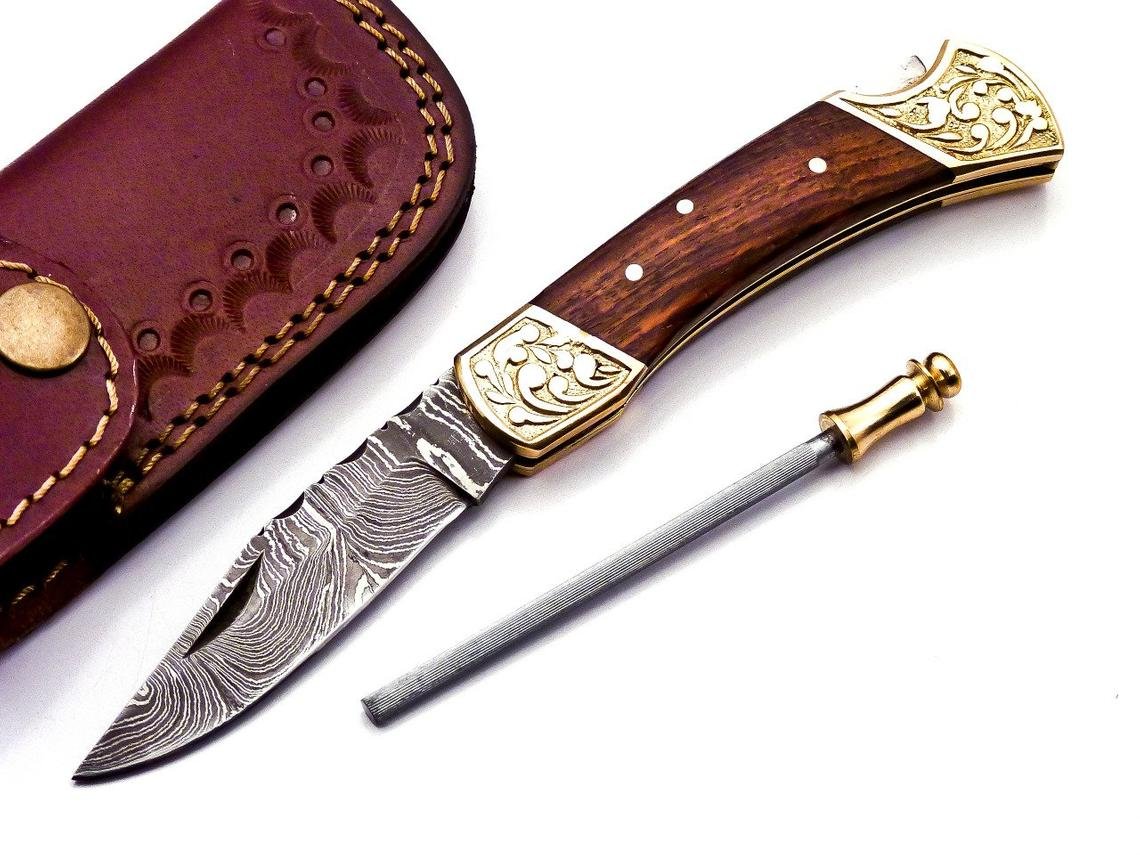 Personalizable Custom Hand Made Damascus Steel Folding Pocket Knife with Handle Olive Wood with Leather Sheeth