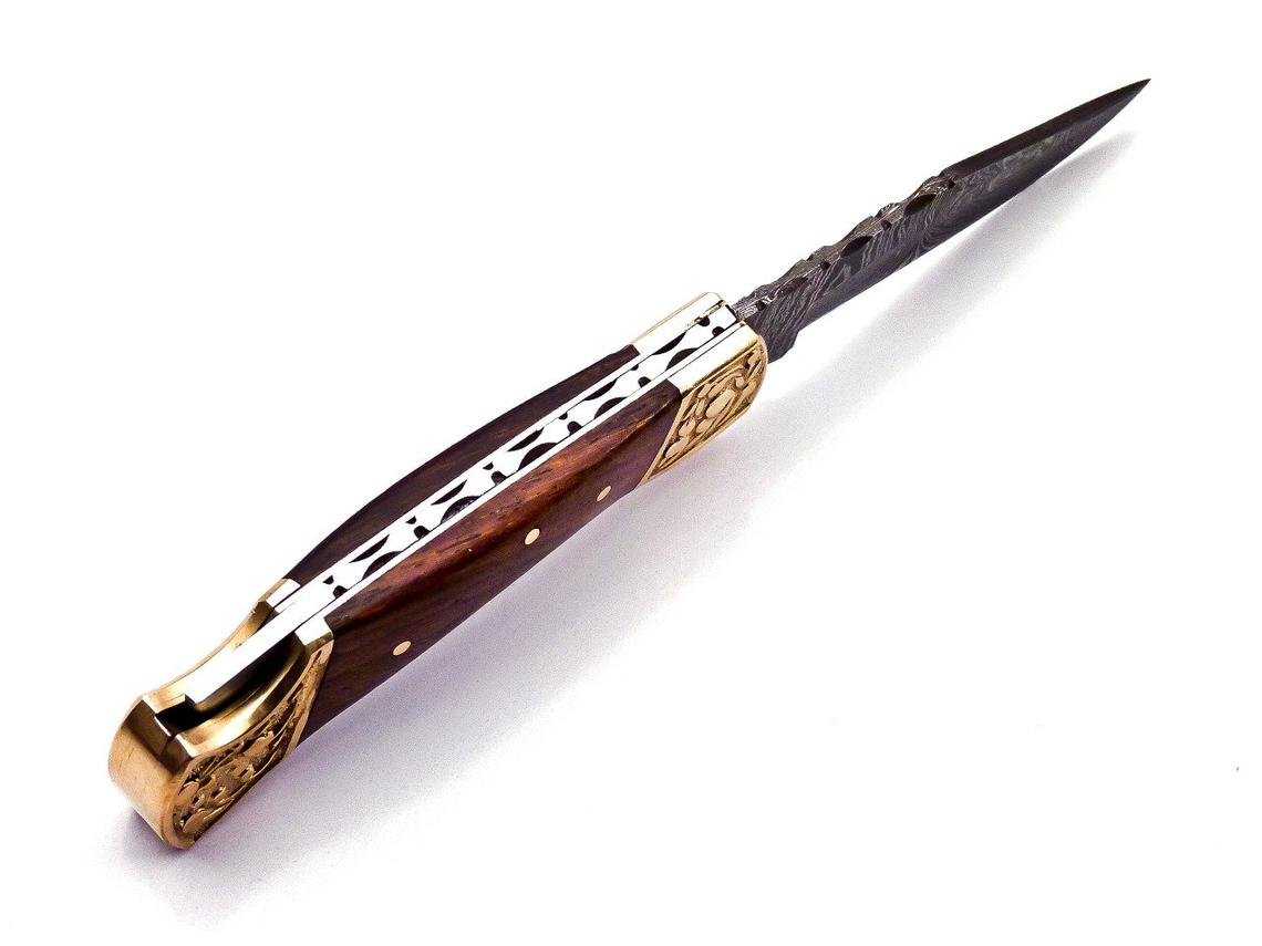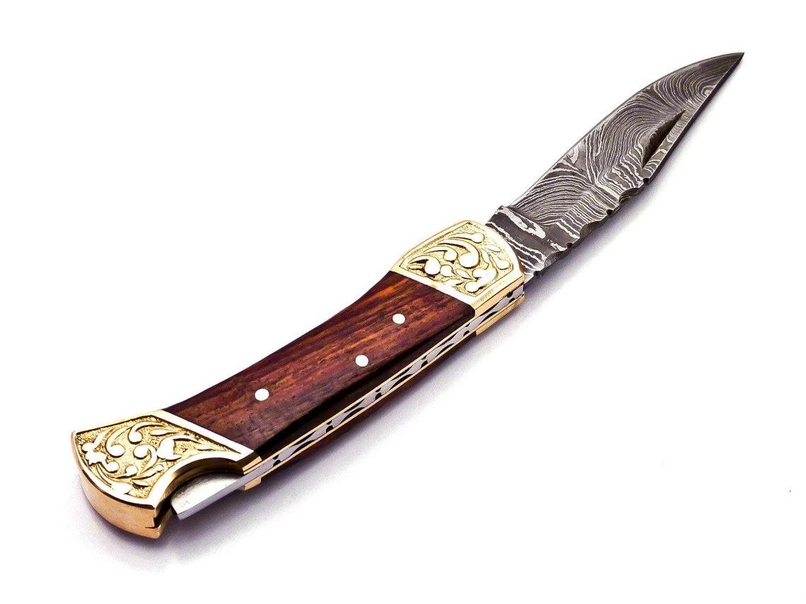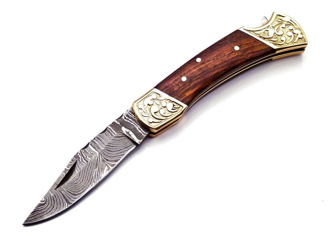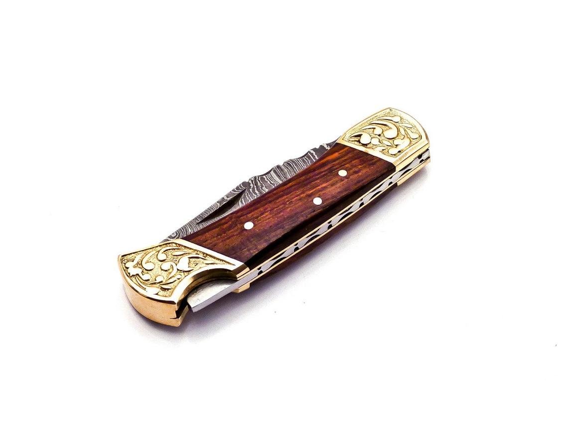Personalizable Custom Hand Made Damascus Steel Folding Pocket Knife with Handle Olive Wood with Leather Sheeth