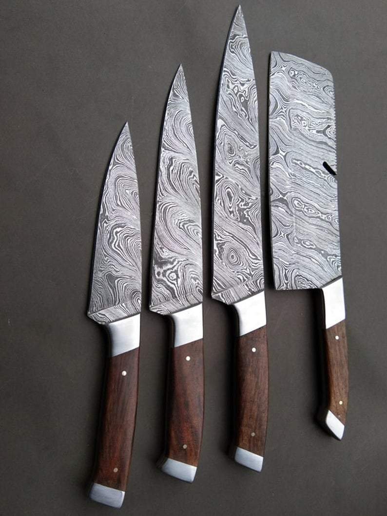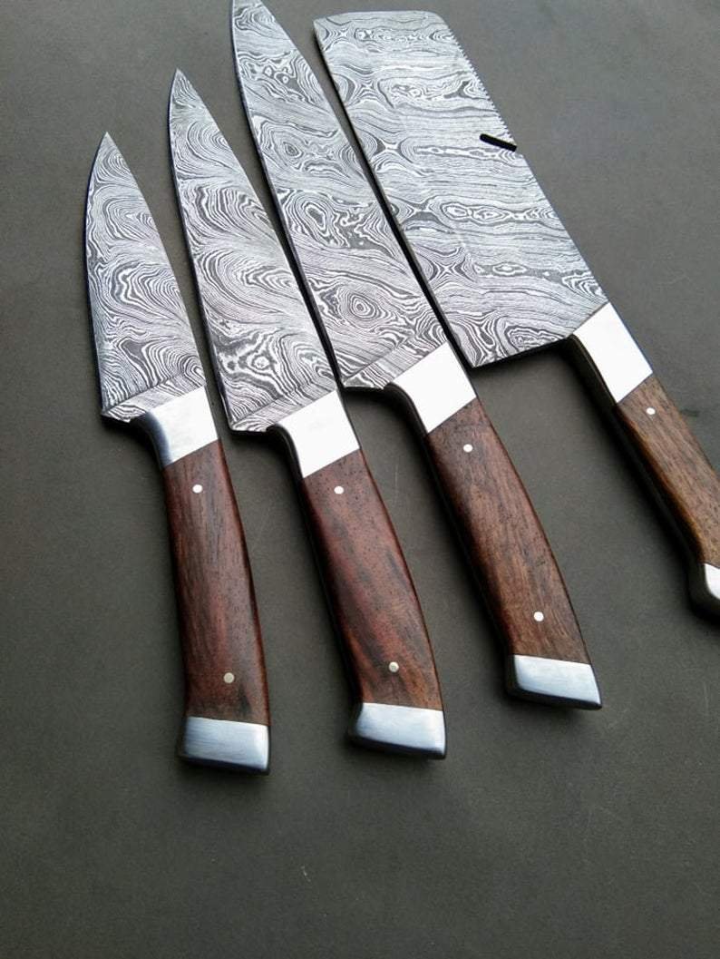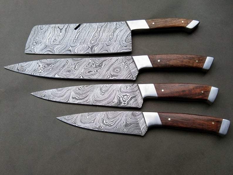 Set of 4 Custom Handmade Damascus Steel Hunting Chef Knife with Rose Wood Handle