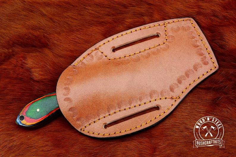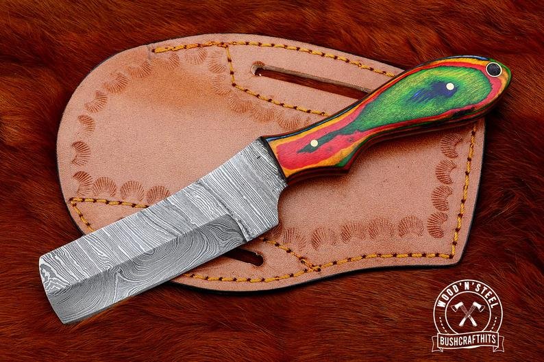Stunning Handmade Real Damascus Cowboy Bull Cutter Knife with Colored Pakka Wood Handle and Customade Leather Sheath Included